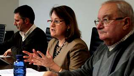 | A decana de Biolóxicas, Mari Luz González Caamaño, presentando a sesión de vídeoforum, con Lourenzo Fernández Prieto (esquerda) e José Antonio Durán |