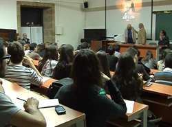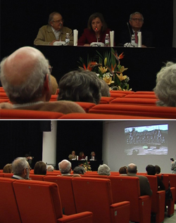 Xavier Castro, catedrático de Historia Contemporánea, presentó a José Antonio Durán, autor de la idea y el guión del documental titulado Sombras sin sombra: Rosalía de Castro, realizado por Jorge (que filmaba la sesión).