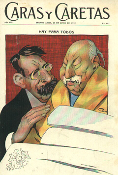 En línea de continuidad, una semana más tarde, otro gallego, José María Cao, uno de los grandes renovadores (españoles) de la caricatura argentina, director artístico de Caras y Caretas, sintetizaba –con sumo afecto- en su dura sección de “Caricaturas contemporáneas”, la nueva traza (mucho más esmerada en el vestir) de Ramón del Valle, fundiéndola con la vieja leyenda, gestada en gran medida por el mismo como personaje: