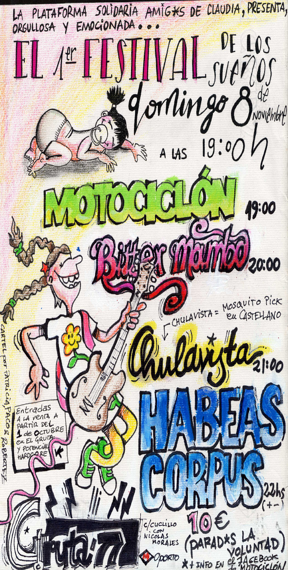 El mundo de los sueños by Noe, Robertez, Angel Kaplan, Lara & Pedro Petit PopEl cartel, quizás lo menos importante por el fin del evento, es para quitarse el sombrero. Los ya «auto-inmolados» Motociclón, se volverán a juntar para darlo todo junto a nada menos que Habeas Corpus. Entre medias, podremos escuchar a Bitter Mambo y a Chulavista. Será el domingo 8 de noviembre en la carabanchelera sala «Gruta 77» y tendrá un donativo de 10 €.